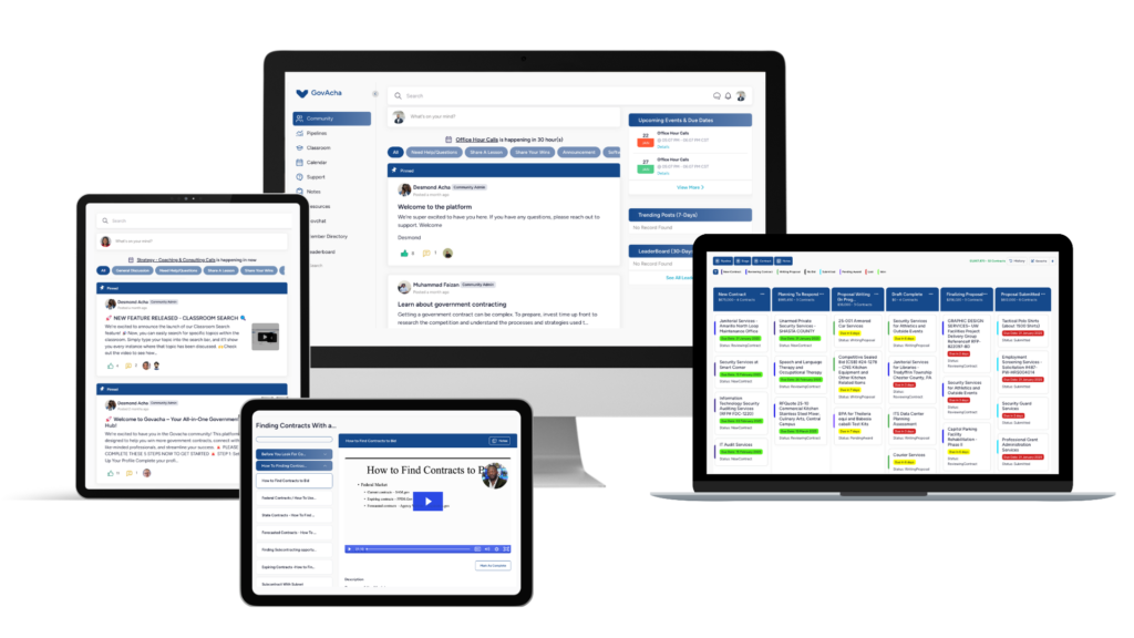 Govacha is more than just a training program – it’s a complete system designed to give businesses the tools and knowledge they need to succeed in the government market. With interactive courses, expert instructors, and a wealth of resources and support, Govacha is the ultimate destination for businesses looking to take their government contracting efforts to the next level.